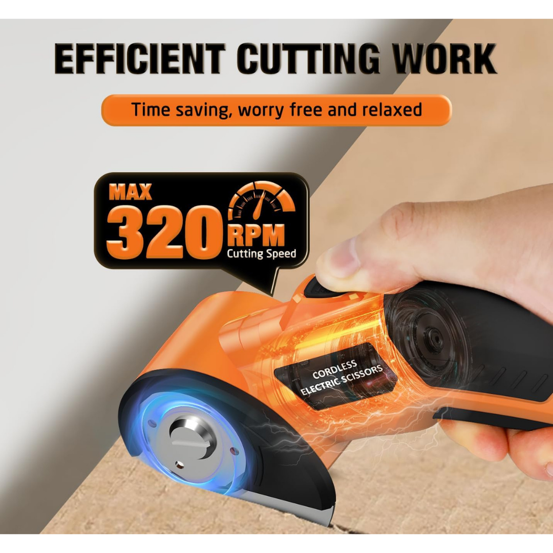 【Ultra-Light & Ergonomic】At just 0.82lbs, these cordless electric scissors serve as both electric box cutter and rotary fabric cutter. Ideal for DIYers, artisans and professionals working with cardboard, carpets or sewing projects. The anti-slip ergonomic grip ensures comfortable extended use.